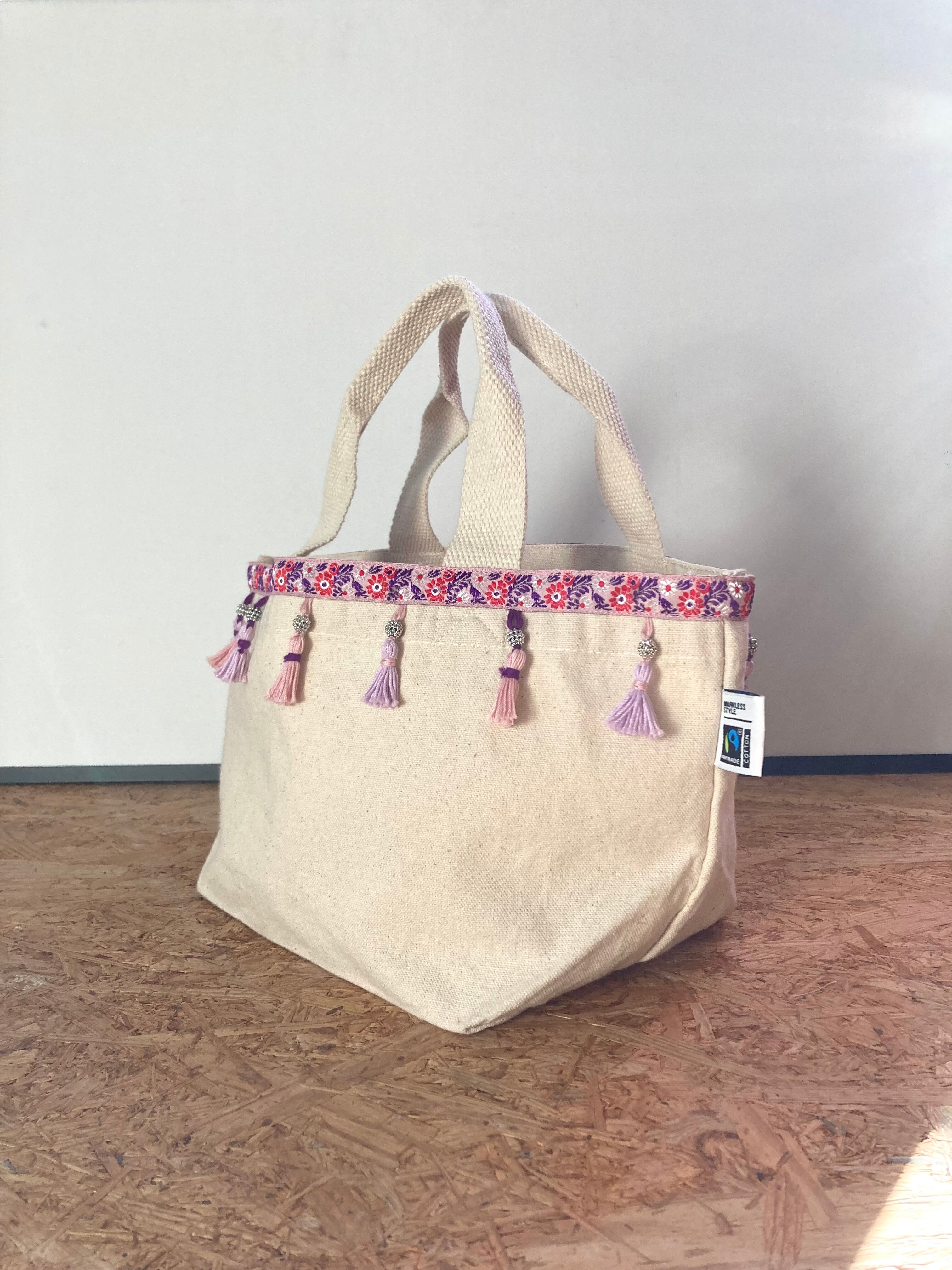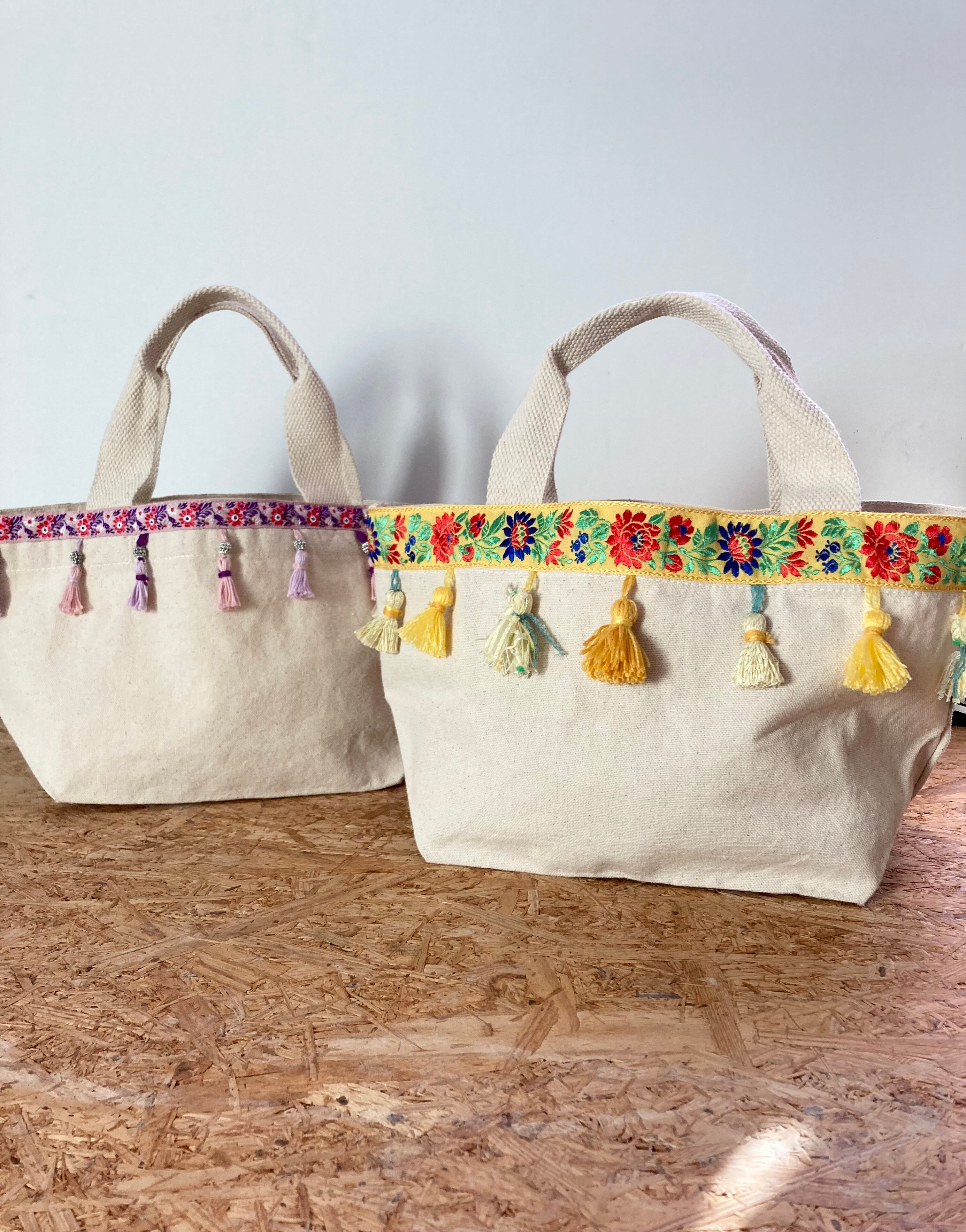 優しい色合いのお花の刺繍リボンと、ゆらゆら揺れるタッセルが目を惹く、ナチュラル素材のオーガニックコットンのトートバッグです。