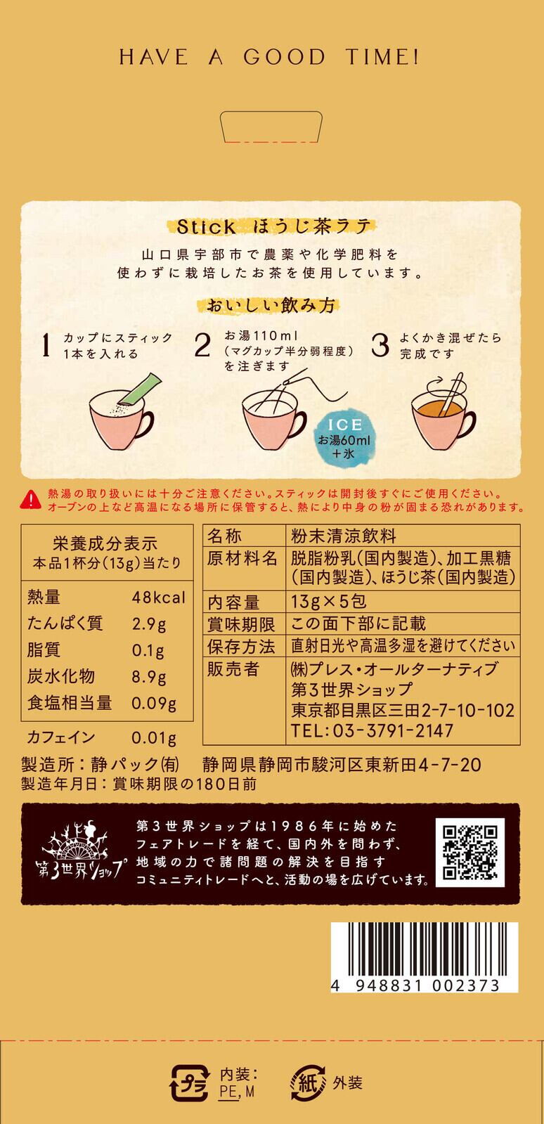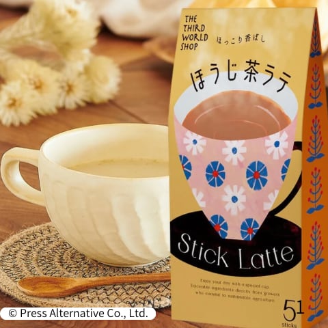 農薬・化学肥料を使わずに育てられた、第3世界ショップのほうじ茶をベースにした粉末タイプのほうじ茶ラテです。